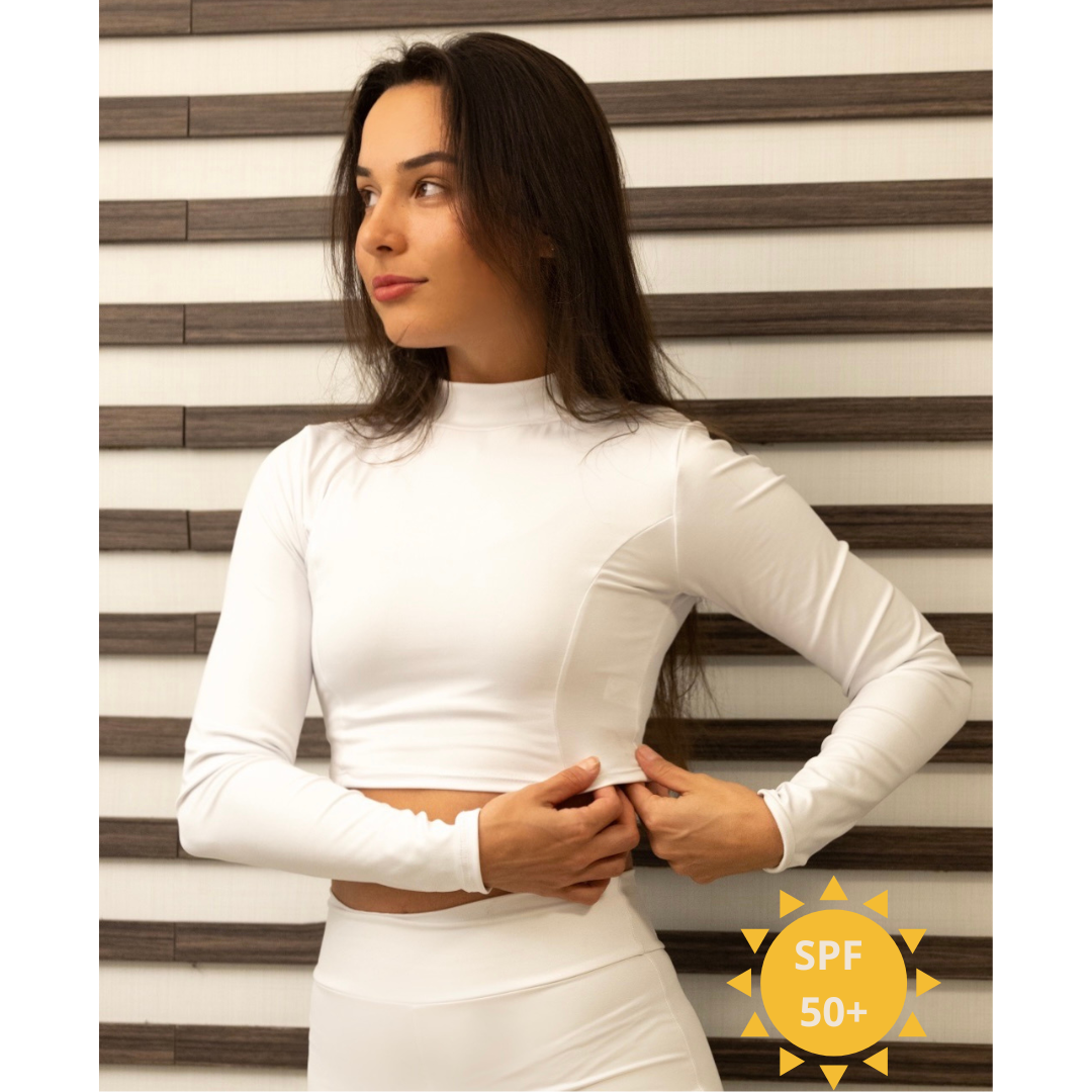 Cropped gola alta e com recortes na silhuenta; ajustada no corpo